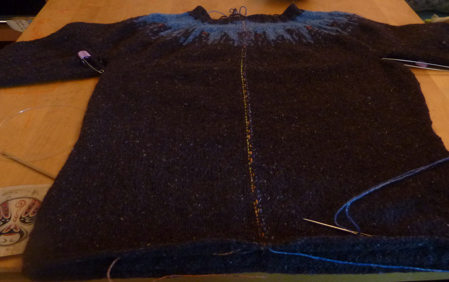 Cityscape: sleeves, yoke, collar, all done!! I thought I’d post some pictures showing how I plan to cut the steek. I’ve never had a problem with steeking, but all my experience with steeks involves lopi, which is a very sticky wool yarn. Felted Tweed is part merino, alpaca, and rayon, and the knit fabric is very light, so long story short I don’t want to cut the steek until after the buttonbands are complete. The pictues below show the steek ready to be cut. I will cut the sweater along the orange yarn, gently pulling it out as I go. I sewed through the knit stitches on either side of the orange yarn, using yellow and blue. Once I cut the steek, I will sew the edges to the inside of the sweater, using sewing thread. Hopefully, I will have pictures of the completed cardie very soon!