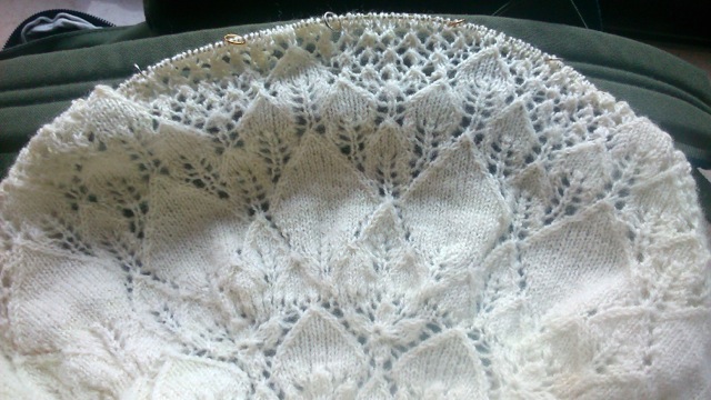 Quiet day, so it’s just a knitting update. I finished chart two, after wasting many about 5 days correcting a very stupid mistake on my part. I’ve begun chart three, though these pictures are taken at the completion of chart two. I don’t think I will do the beading on this project, I don’t have enough shawl experience to tackle beads.