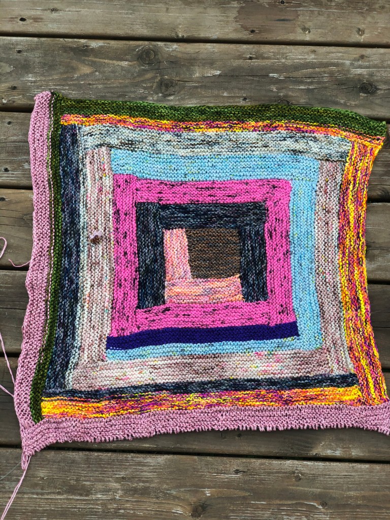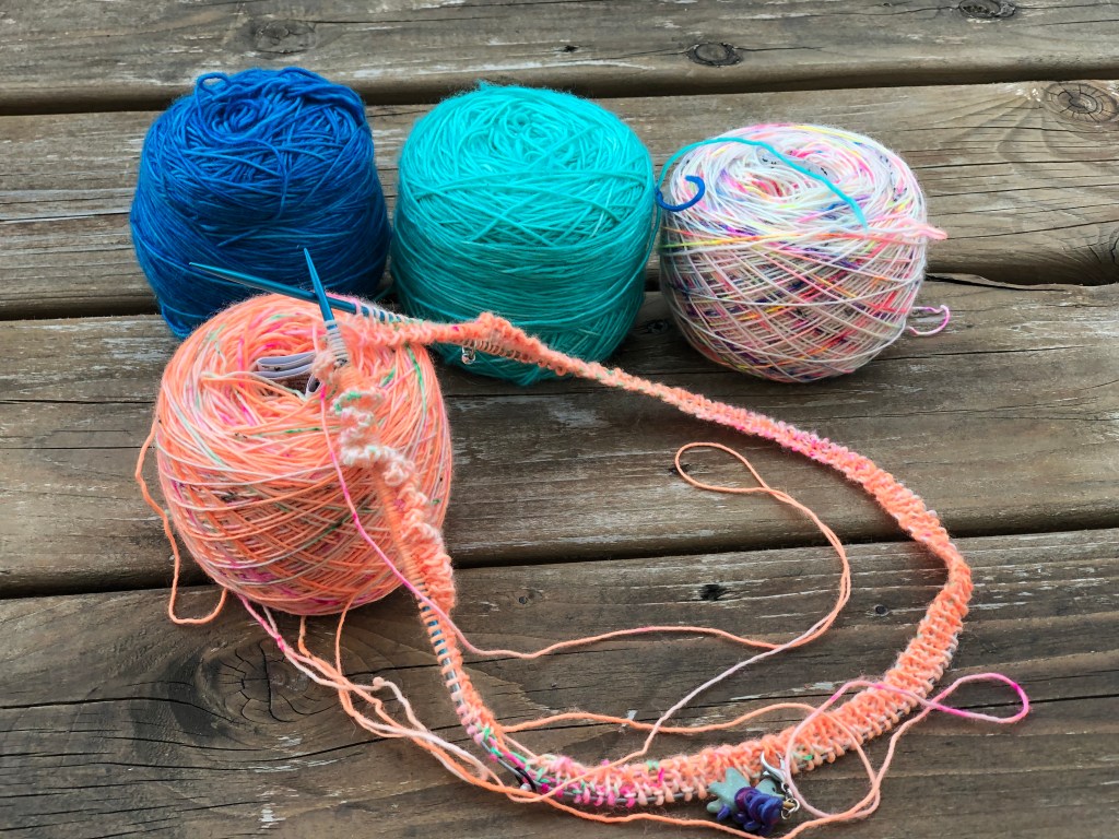 I’m working on a full size sweater swatch. The colours are a little crazy, especially for a garment. It’s not just a gauge swatch that’s required, but a colour swatch too. Might as well begin the sweater fully prepared to have to frog it all. The pattern is 3 in 1 by Atelier Alfa, the blue yarns are Madelinetosh Merino Light and the speckled colours are Hedgehog Fibres Skinny Singles.