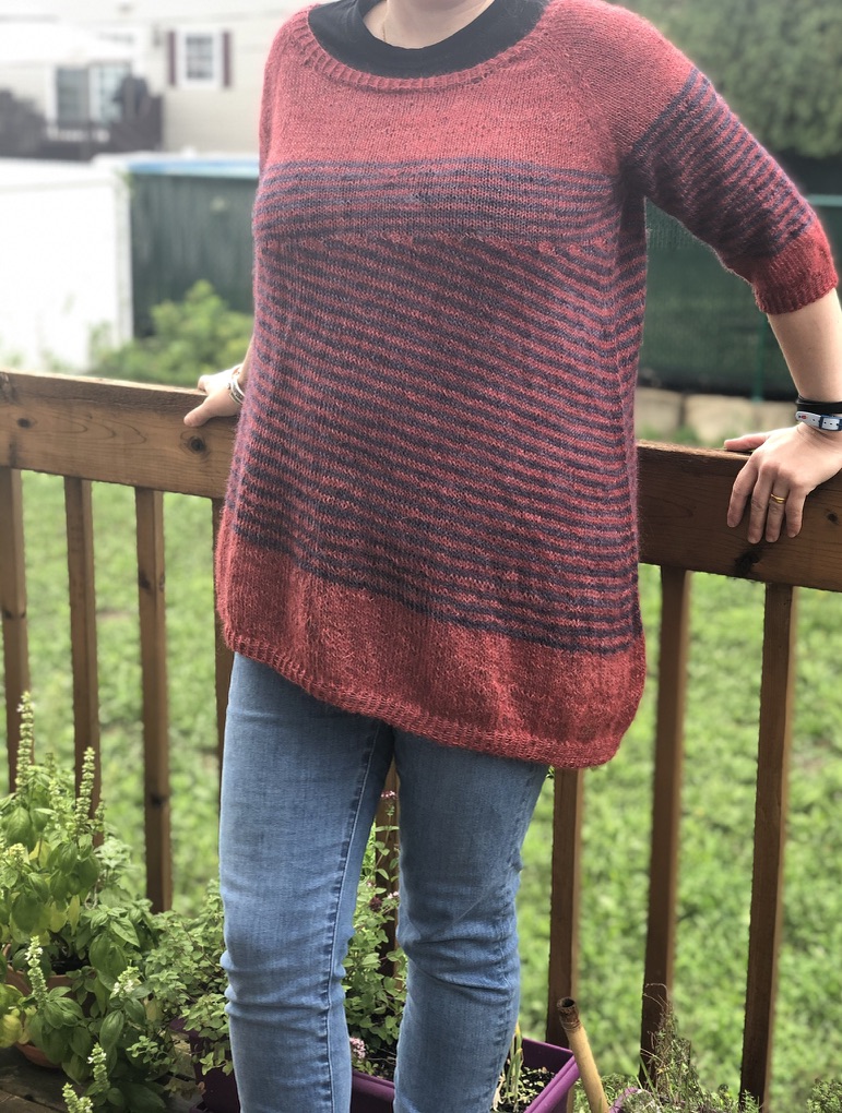 I finally finished this sweater!! I started it last summer, and set it aside after separating for the sleeves. I picked it up and put it down many times since then. The stripes made it easy to keep track of my progress, so I didn’t feel huge pressure to finish it. The yarn is a Wensleydale and Shetland mix, 50%-50% I think. It was a little odd to work with, it felt like Icelandic lopi wool. It has softened up with blocking, I don’t mind it next to my skin. It is in no way merino or cashmere soft, but I don’t care about a little scratchiness. The fabric has a gauze-like open feel to it, very different from how a typical woollen spun yarn would knit up. I have no idea if this is a worsted or woollen spun yarn, but I think it’s the Wensleydale content (it’s a long wool breed) that is stopping the yarn from plumping up the way a typical Shetland wool would.