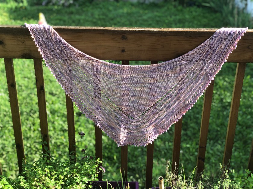 Just a small one-skein shawl, but it is cosy and I love it. I love the colours in this yarn. The colour changes quite frequently, but the changes are not strong enough to create colour barf when knit up. You know, those gorgeous skeins of yarn that have a bunch of contrasting colours that look amazing in the skein; once you wind that skein into a ball you start to have doubts but forge ahead and start knitting until you have to give up, frog and put that yarn aside in the to-be-socks pile. Or is that just me?